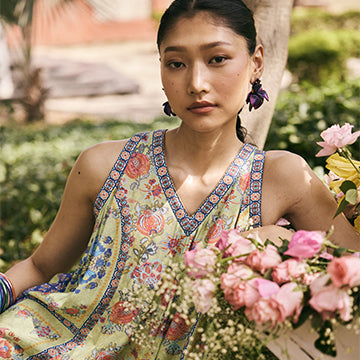Jheel is a bright ombre kurta set featuring a straight-cut printed kurta paired with moss green khada-pajama style pants and a statement printed dupatta. Zari and mirror work highlight the placket and gota tassels hang off the edges of the dupatta.